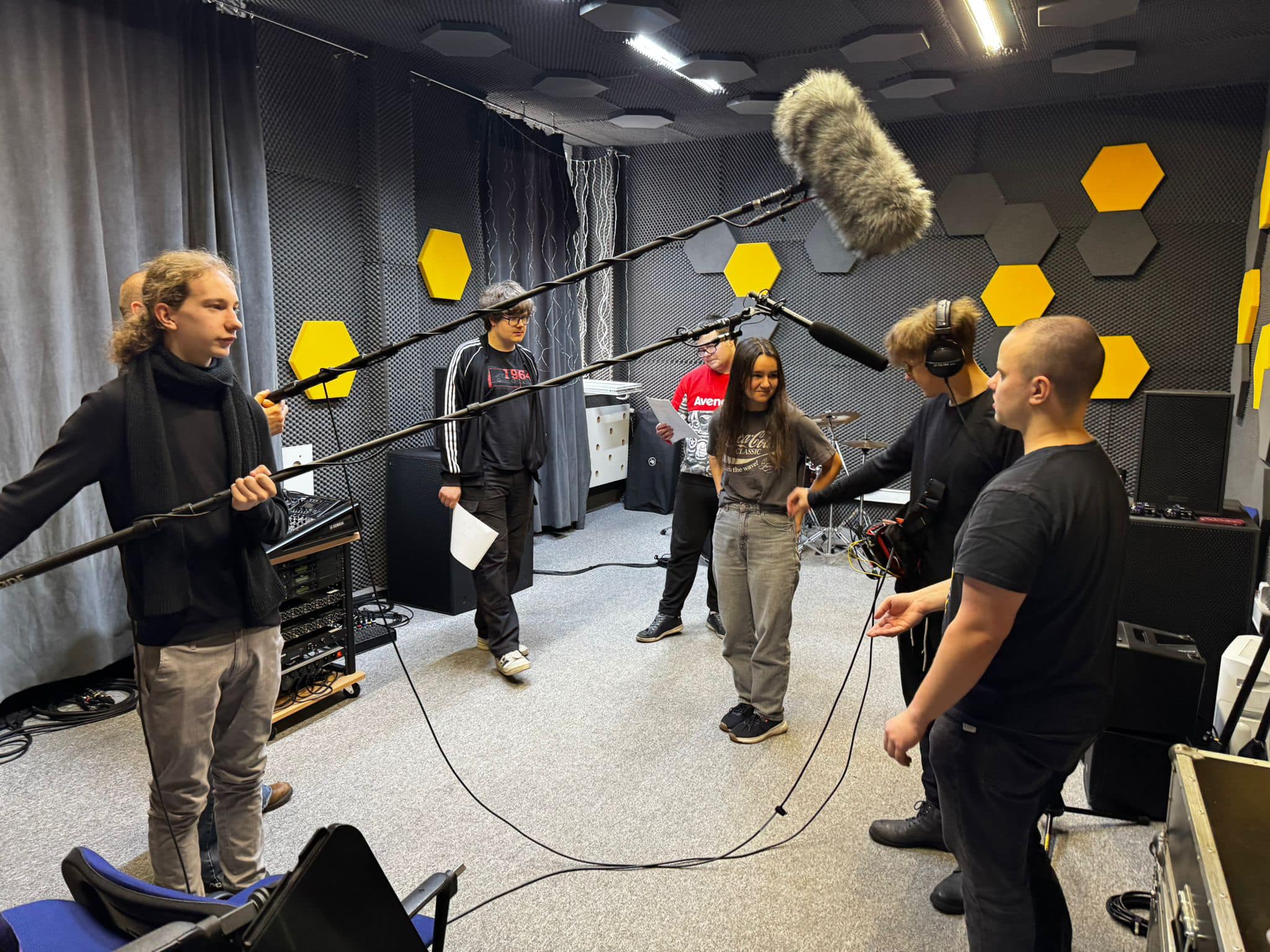 Każdy mógł poczuć się jak prawdziwy realizator, trzymając tyczkę mikrofonową i testując różne techniki nagrywania dźwięku na planie. Na koniec wspólnie zrealizowaliśmy scenkę, sprawdzając w praktyce, jak ważna jest precyzja w pracy dźwiękowca.